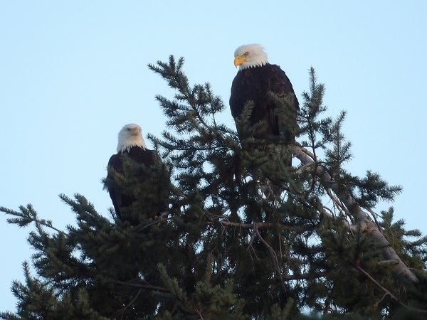 Our resident pair of bald eagles nests and hangs out in our neighbor’s fir tree. The other day, we watched their brief mating dance up there, accompanied by a lot of “singing” afterwards.