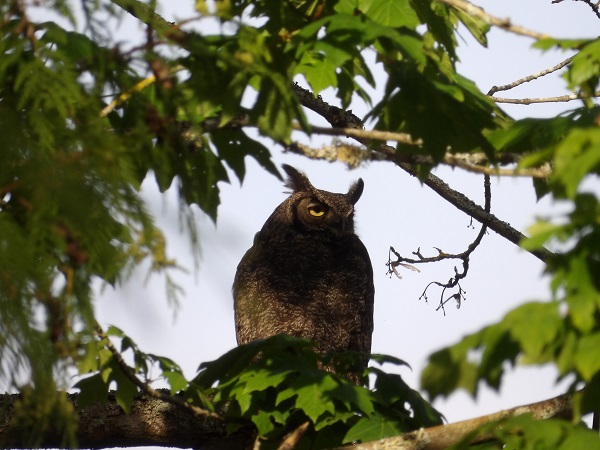 And a grumpy-looking great horned owl. Thor was doing his “hoo-whoo” call, and the owl did not look amused.