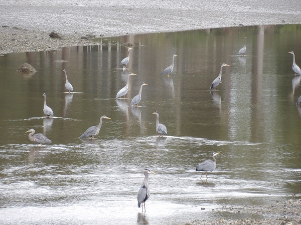 Driving home the other day past nearby Drayton estuary, we saw an unusually large group of great blue herons fishing at low tide.