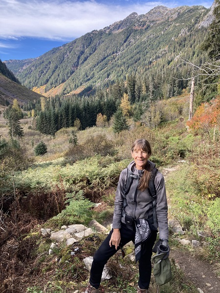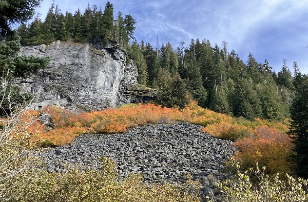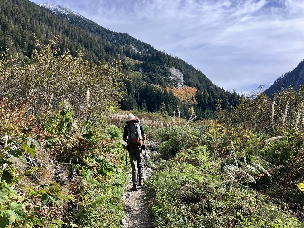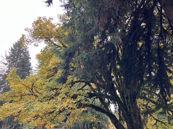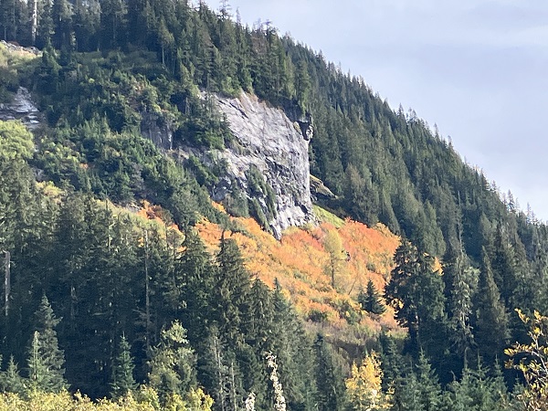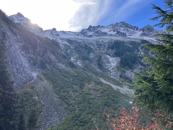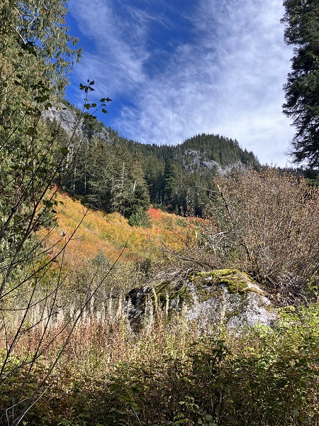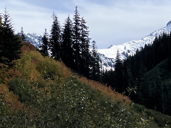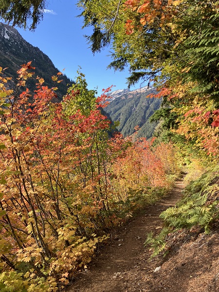 Thor and I just returned from a wonderful, restorative vacation on Maui — and next week I will start the promised blog about our trip, with underwater photos of our snorkeling and encounters with sweet Honu turtles among other denizens of the sea. But this week the weather reports predicted the usual endless rain from the weekend on, so we seized a sunny midweek day for what will probably be the last hike of the season in nearby Mt. Baker Wilderness. (We aren’t spoiled or anything.) We had planned to try one more of the high-mountain trails, but early snowfall has closed the road access, so we opted for the Hannegan Pass trail that starts a bit lower along the Mt. Baker Highway. One of the best parts of autumn here are the leaves turning on the big-leaf maples along the highway — venerable Ent trees among the green cedars and firs.