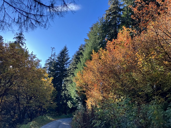 The rutted dirt road meanders for 7 miles as it climbs between ridges clothed in fall colors.