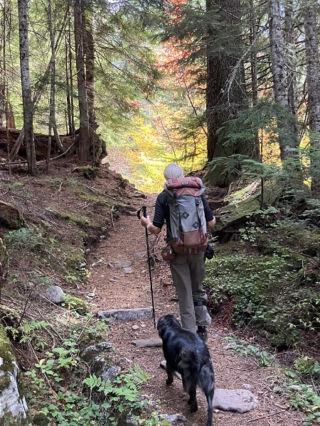 Thor was happy to be hiking on actual dirt instead of the rough rock rubble of our previous two hikes. He, also, has a “geezer challenge” with the nerve damage in his right leg that requires a stiff assistive brace. But he proudly carries his 40-year-old custom-made knapsack that declares him a veteran hiker.