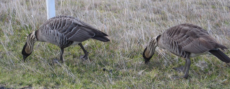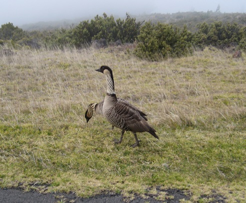 On the drive down, we descended into the clouds that often ring the volcano. We were lucky to see two of the endangered Nene geese browsing right beside the road. We stopped, enjoying their sweet cooing voices, as they seemed not bothered by us.