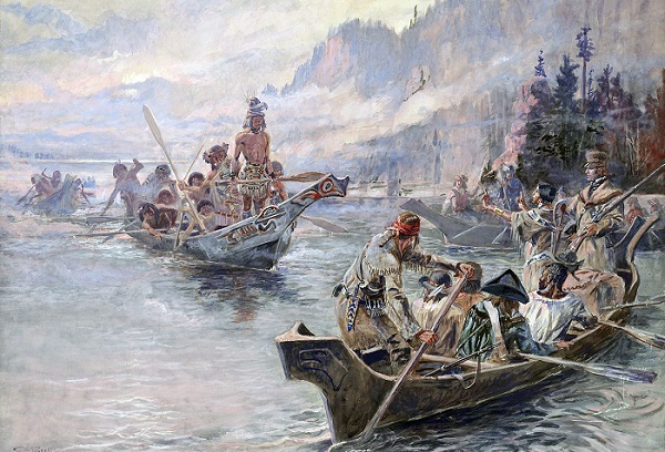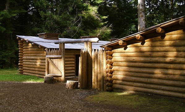 The documentary also detailed many of the survival skills possessed by the men of the team. People were tough in those days! At one point, the men had to drag the heavy keelboat and supplies over miles of portage, a landscape covered with prickly pear plants that tore through their moccasins every two days. They had to sew new footwear at night, and could barely hobble with the painful wounds from the sharp spines. On another stretch of the river, they started to encounter grizzly bears, and the initial excitement quickly wore out as they had to fight off the aggressive bears that could hardly be stopped with multiple rifle shots. With mistaken information about a “quick route” over the Rocky Mountains, they ended up traversing them as winter fell, bringing freezing and near-starvation, but somehow they made it through to a tribe that kindly took them in and fed them until they recovered. They then learned how to make canoes to continue their journey on the Columbia River to the Pacific Ocean. (Top photo of painting by Charles Marion Russell, “The Corps of Discovery Meet Chinooks on the Lower Columbia.”) There they built a fort to suffer through another very wet and cold winter.