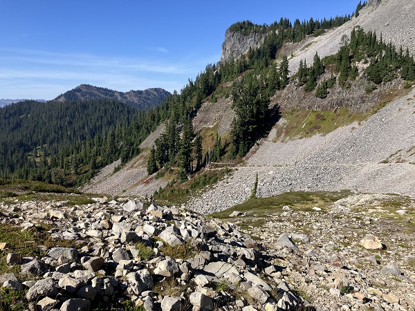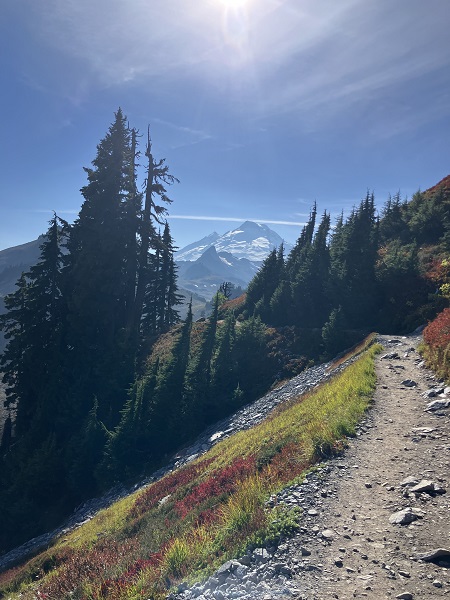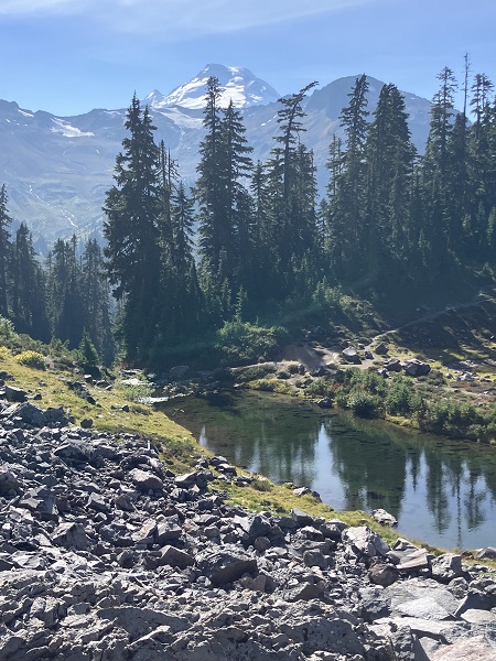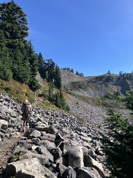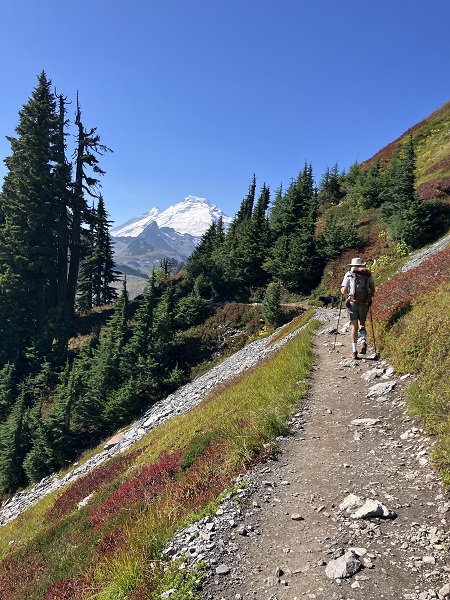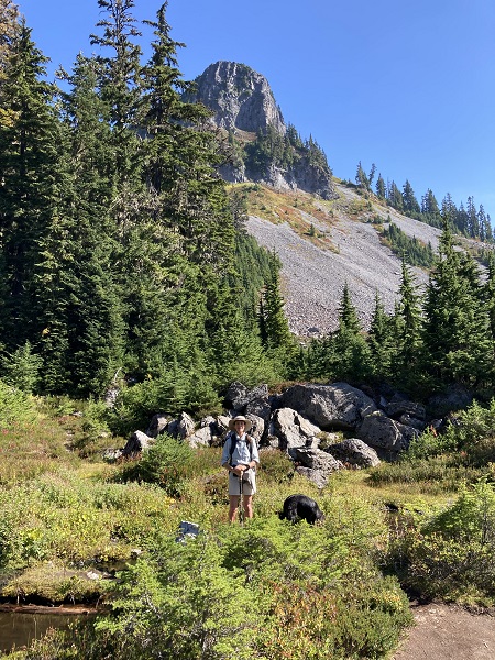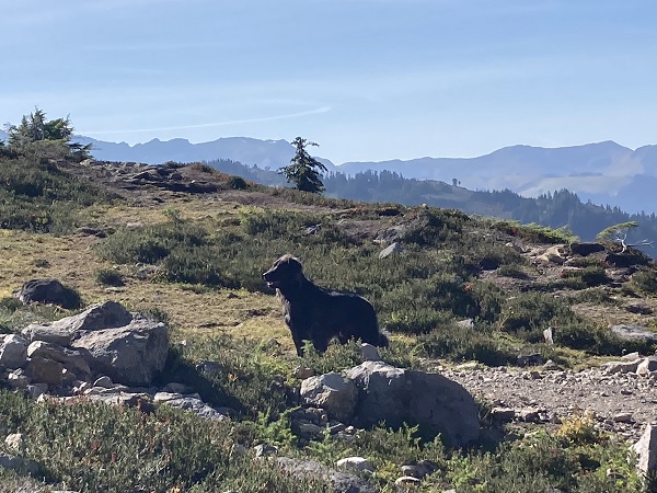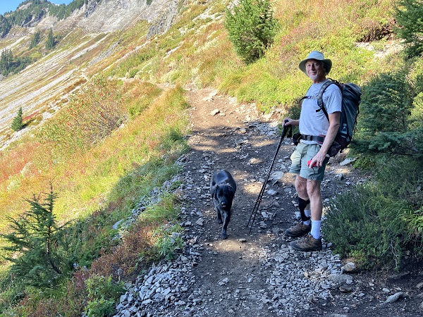Encouraged by my better-than-expected energy on our previous week’s hike below Mt. Shuksan/Mt. Baker, Thor and I decided we’d try a more challenging hike on one of the last sunny days of late September. The Chain Lakes Trail involves a lot of rocky terrain from old avalanche chutes, along with an uphill trail on the way back. There was a bit of wildfire smoke haze in the sky, but otherwise a perfect day, with a mild breeze. So good to be back in the mountains!