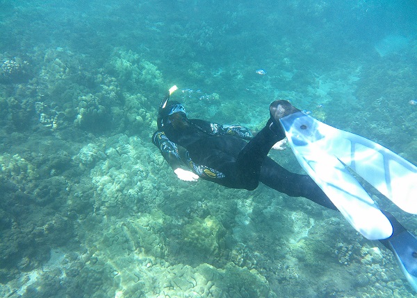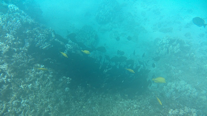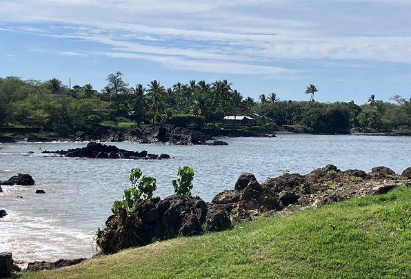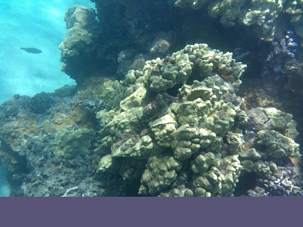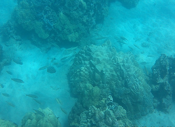 A typical cove with lava outcrops that harbor fish and other sea life among coral growths. Usually we swim out a ways along the lava peninsulas to get into clearer water away from shore.